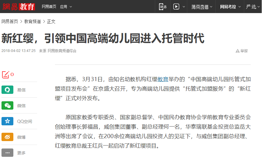 新紅纓,立志做高端幼兒園托管專家,期待其以實際行動帶(dài)領中國高端園市場(chǎng)走向完善與成熟。